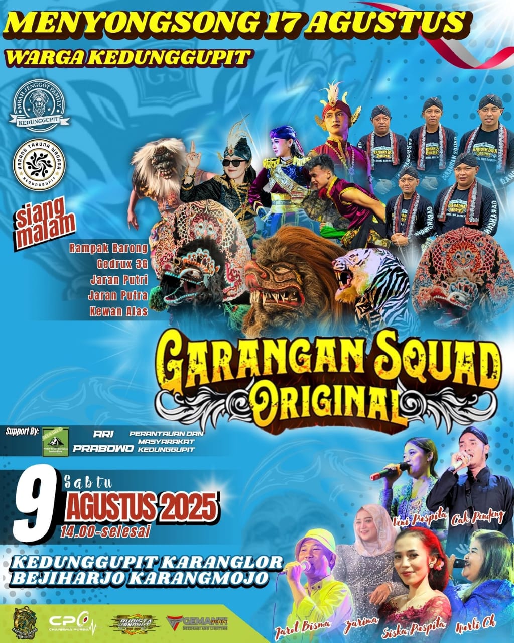 GUNUNGKIDUL – Dalam rangka menyambut Hari Kemerdekaan Republik Indonesia ke-80, Garangan Squad akan tampil menghibur di Pedukuhan Karanglor, Kalurahan Bejiharjo, Kapanewon Karangmojo pada Sabtu, 9 Agustus 2025 mulai pukul 12.00 hingga 23.00 WIB.