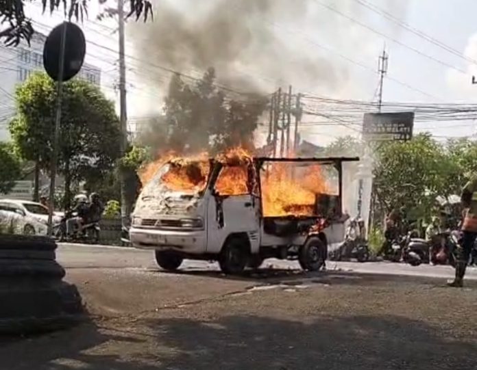Meski mobil pickup berwarna putih dengan nomor polisi AB 82 EU tersebut terbakar, namun pengemudi sekaligus penjual tahu bulat berhasil menyelamatkan diri dari kobaran api.